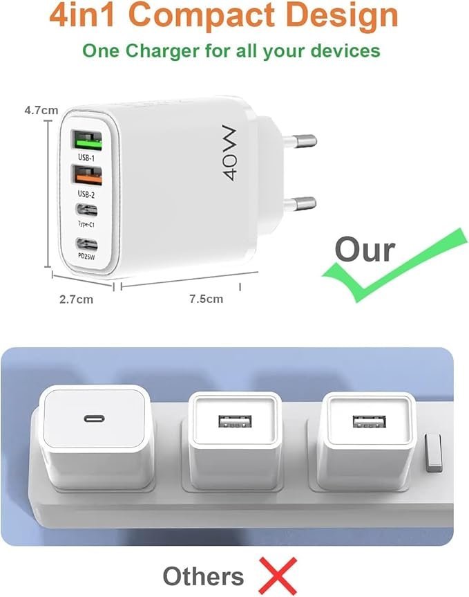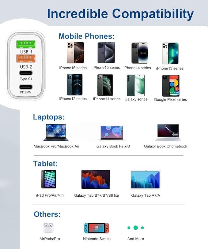 - 【PD25W+QC 3.0 Fast Charging】: 2 USB C and 2 USB A ports, both supporting fast charging, can adapt to different currents according to different devices, ensuring voltage stability and safety while fast charging devices.