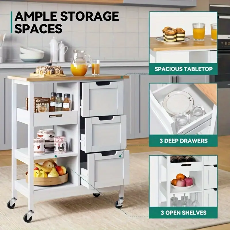 Phabules Rolling Kitchen Island Cart with Countertop and Drawer, 3 Tier
